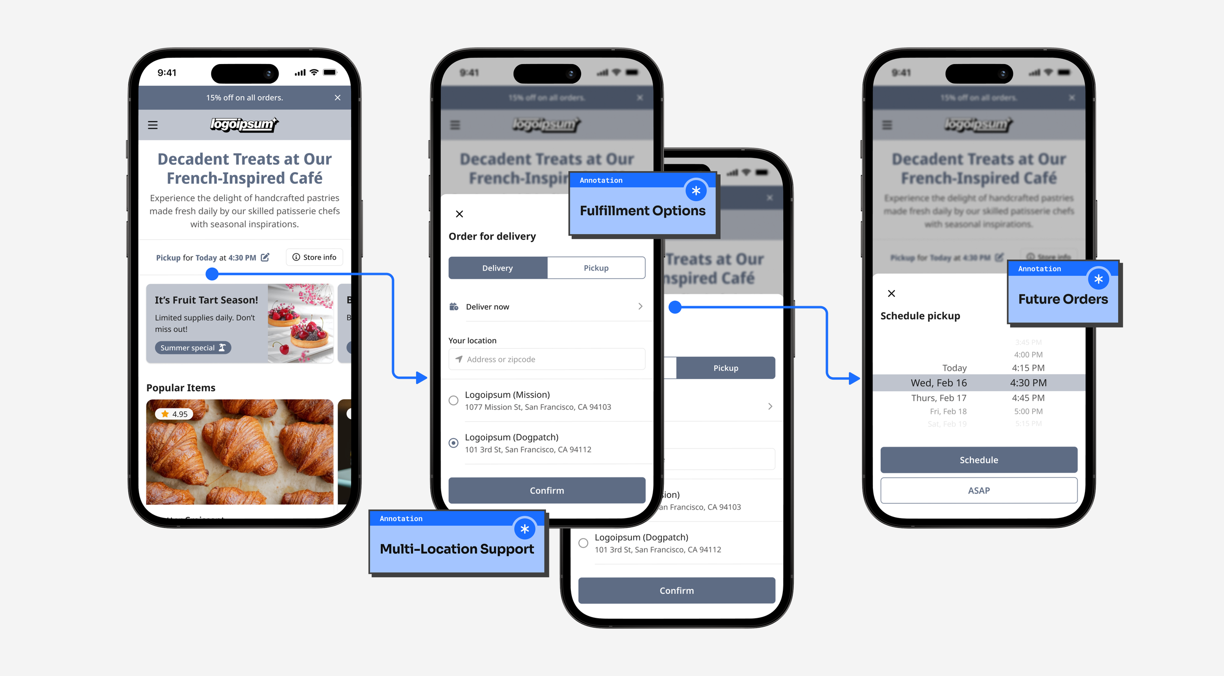 One panel handles every fulfillment rule: pickup, delivery, multiple locations, and scheduled orders. Placing all options in a single overlay reduces decision time and eliminates edge-case logic from the core flow, making the system easier to maintain and quicker for guests.