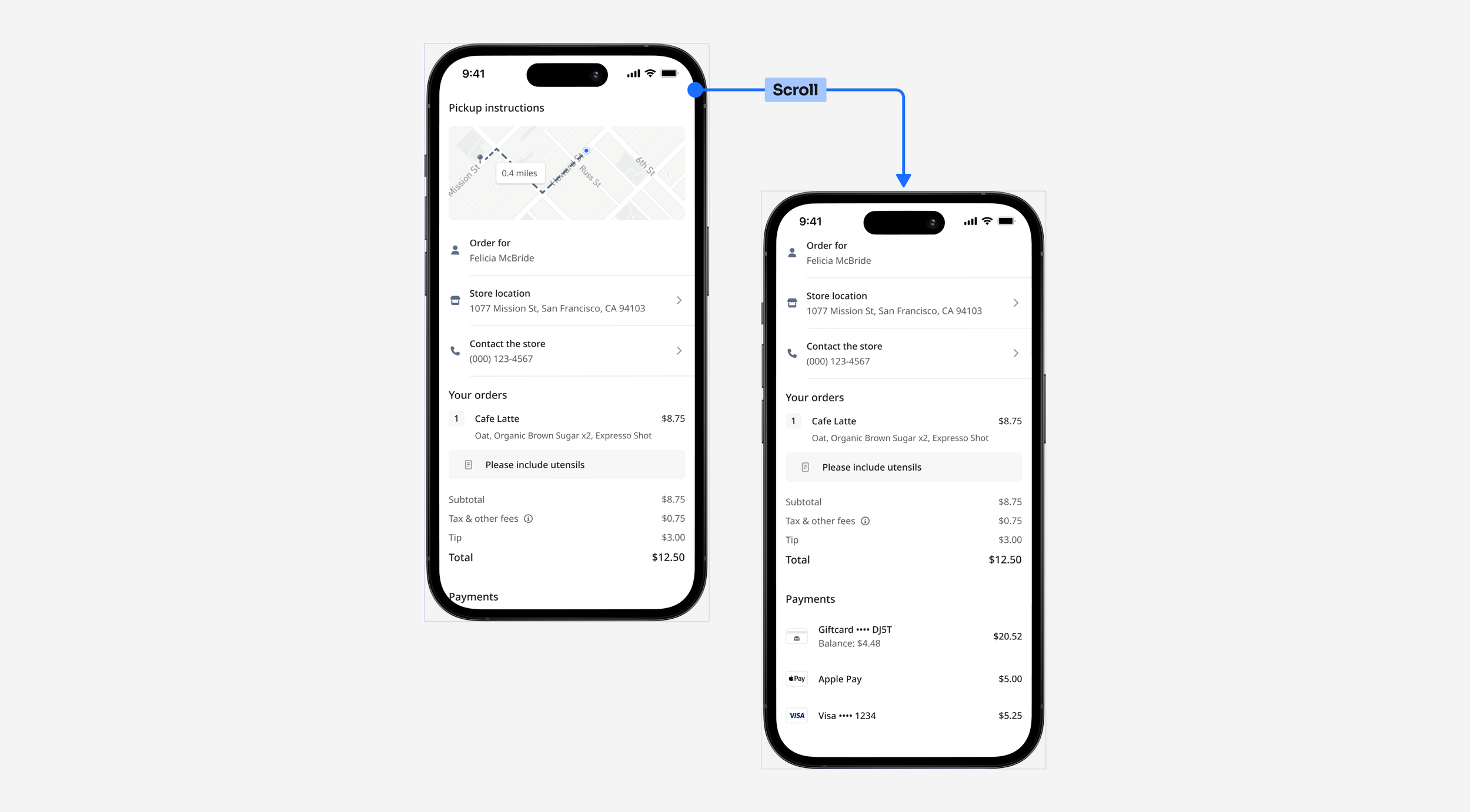 The receipt doubles as a help hub. Customers can view store information, call the location, or review payment details all in one place. A scroll prompt signals more content, preventing missed information on long orders.
