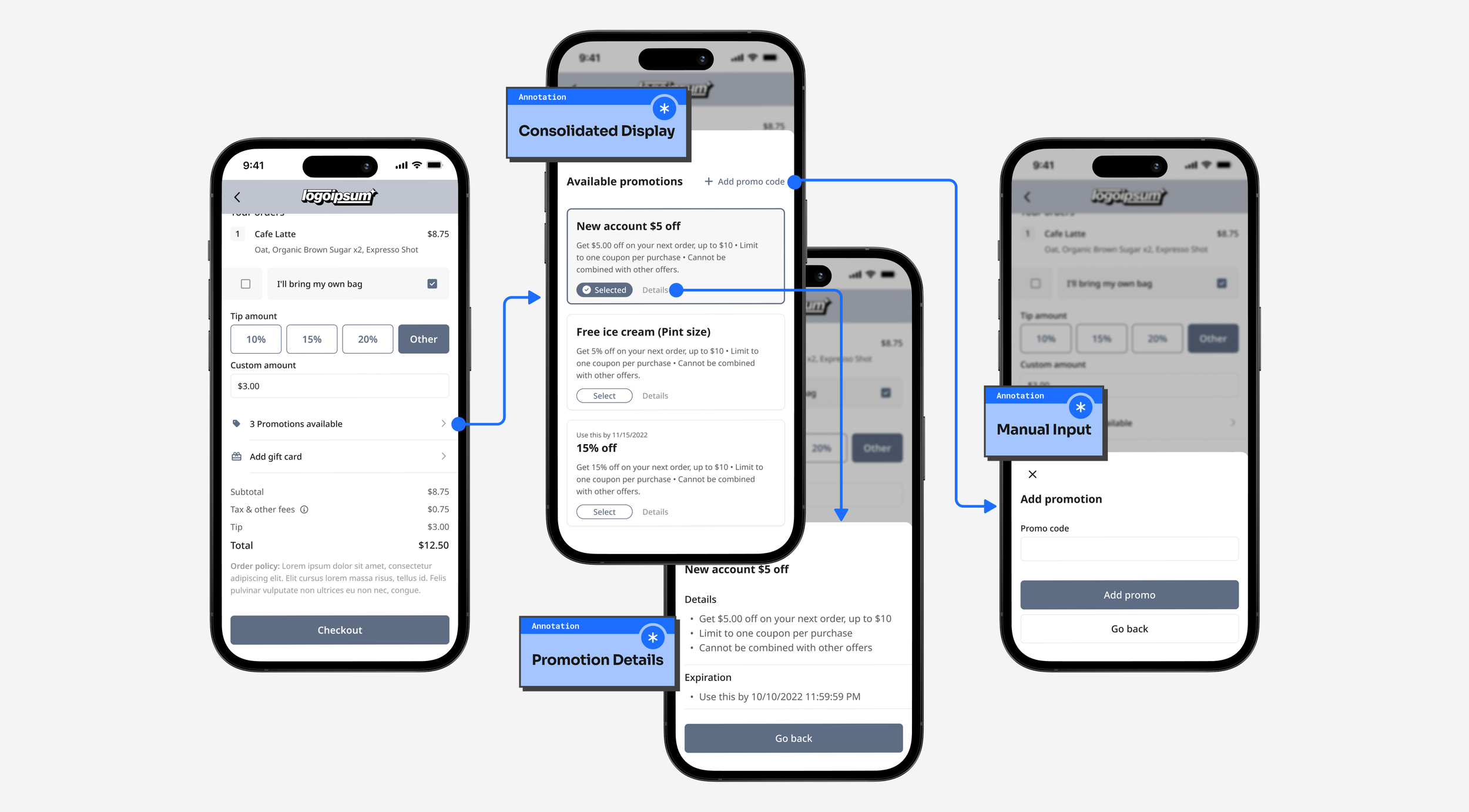 A single panel lists every active offer. Diners can select to apply or type the promo code in the same view. Promotional details are shown as a popup, without overcrowding the checkout view.